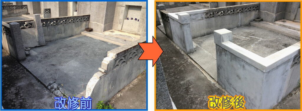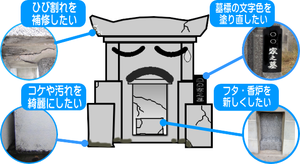 お墓は日差しや雨に長い年月さらされると、ヒビが入ったり欠けてしまう場合があります。 当社は、ヒビや欠けの補修 ・ お墓の掃除 ・ 古くなったお墓を全て新しく建て替える、一部だけを新しい物に交換する事ができます